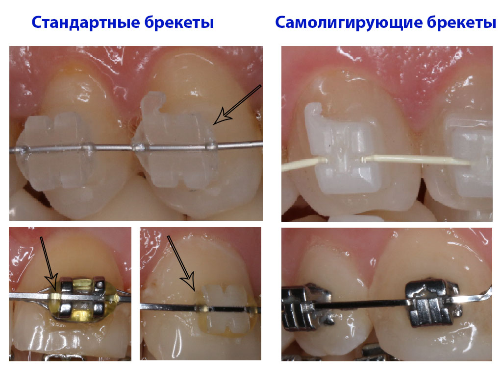 - лигатурные — когда дуга на брекетах закрепляется специальными тонкими проводниками или эластичными резинками — лигатурами;