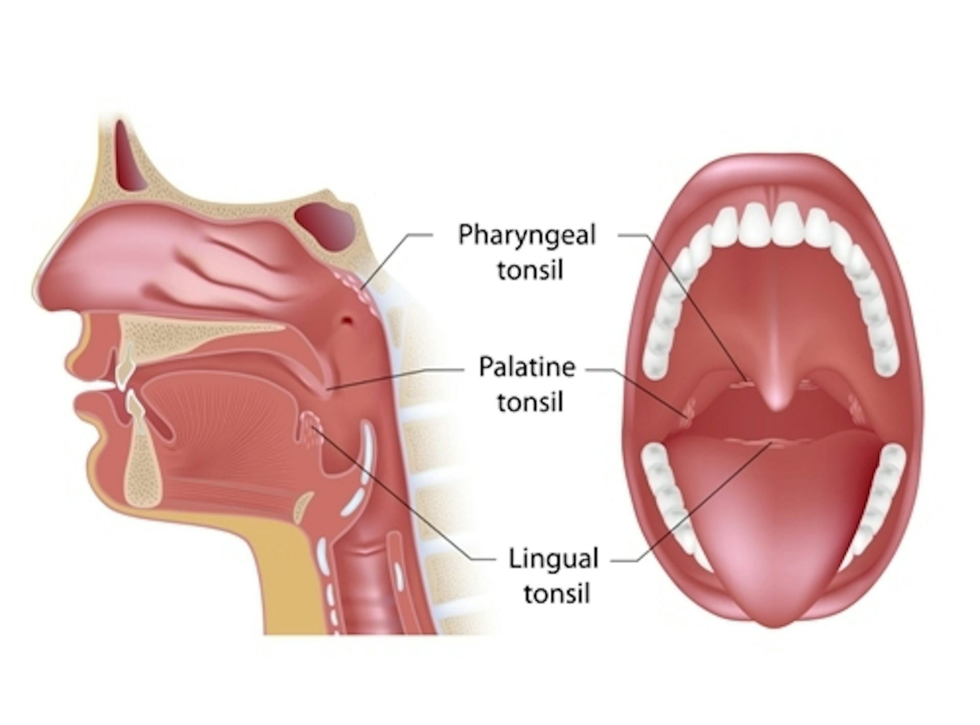 То, что большинство людей называют их миндалины — это небные миндалины, которые вы можете увидеть в задней части рта или в верхней части горла.