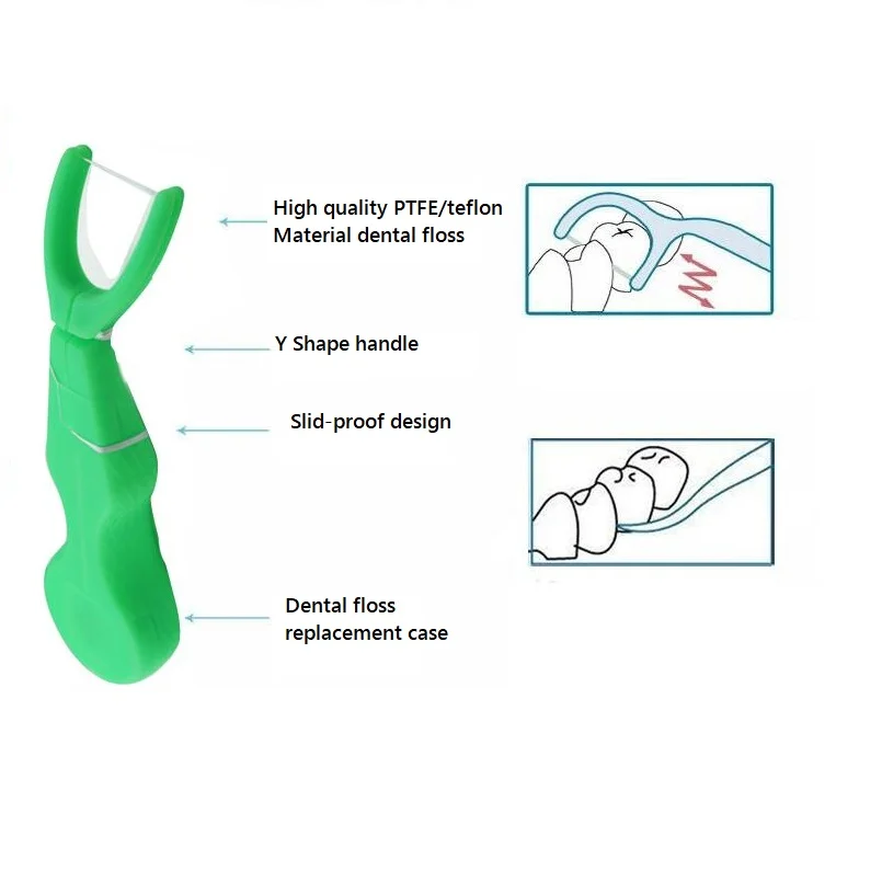 Нить легко оборачивает поверхность зуба, обеспечивая эффективную чистку зубов, а пластиковая ручка облегчает удержание нити.