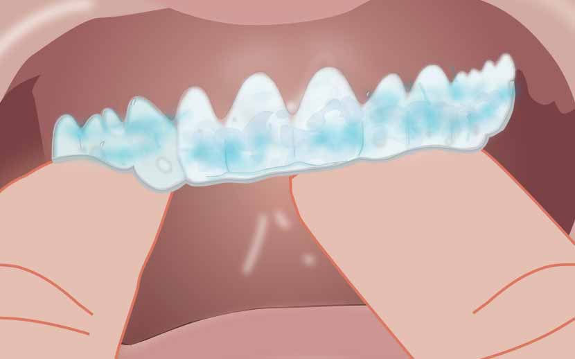 После нанесения геля на зубы его облучают ультрафиолетовой лампой. При этом высвобождается кислород, который способен проникать в толщу эмали и разрушать пигменты, придающие нежелательный оттенок. Для получения результата процедуру повторяют несколько раз подряд. Кратность зависит от того, на сколько тонов нужно осветлить зубы.