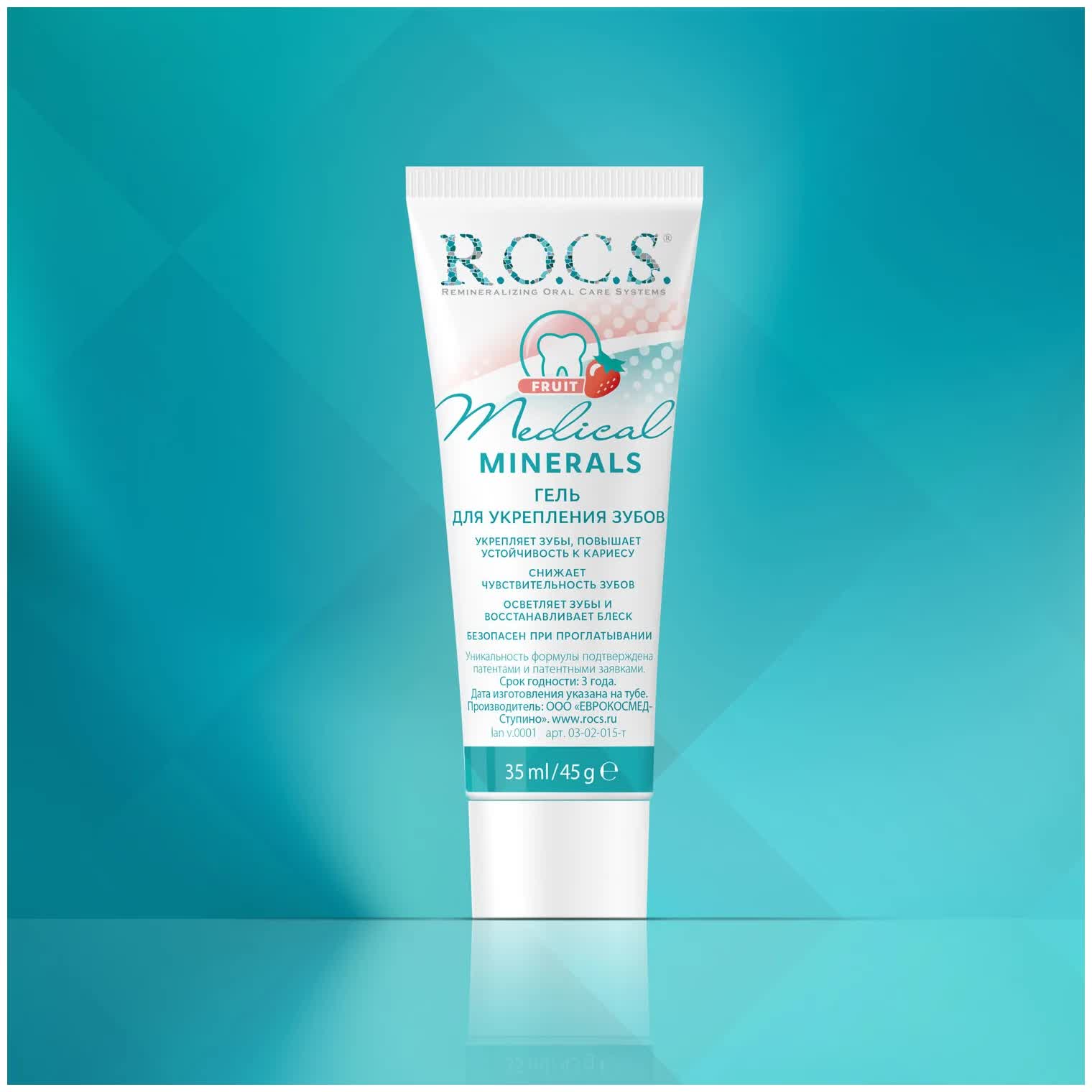 Уникальный гель для укрепления зубов R.O.C.S. Medical Minerals является источником легкоусвояемых соединений кальция, фосфора и магния. Благодаря специальным компонентам тонкая невидимая плeнка геля задерживается на зубах на длительное время, что обеспечивает постепенное проникновение активных компонентов в ткани зуба.