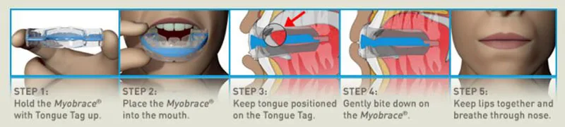 Устройство Myobrace имеет мягкую и гибкую внешнюю часть, а также твердую внутреннюю часть. Устройство имеет проверенную двойную функцию: исправление вредных привычек полости рта, которые могут привести к проблемам с развитием зубов, а также помощь в выравнивании зубов в естественном положении. Он тренирует язык правильно располагаться на верхней челюсти, переучивает мускулатуру рта и прилагает легкие усилия, чтобы удерживать зубы на прямой линии. В лечении также используются миофункциональные упражнения и процедуры для устранения вредных привычек полости рта.